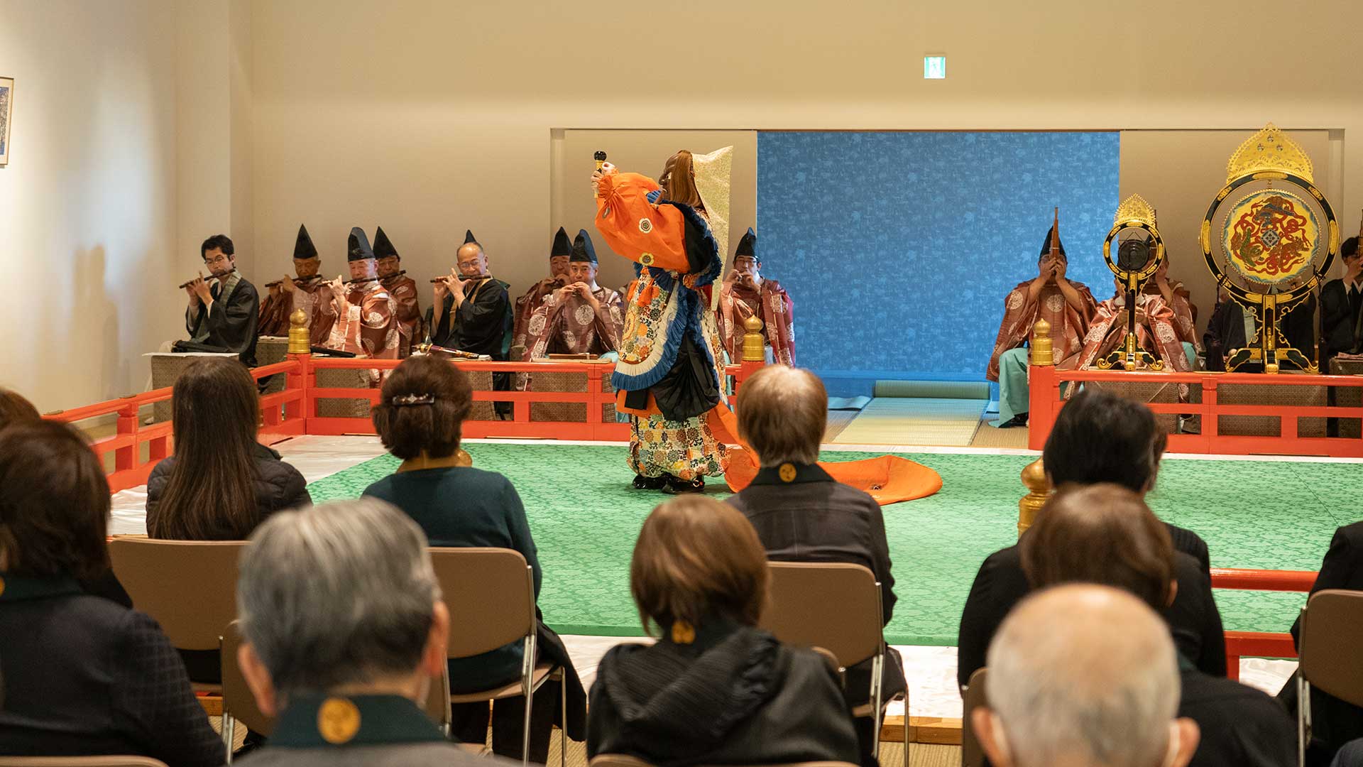 舞楽は本来、神仏へ奉納されるためのものであり、欄干の朱や樹々の緑や青の鮮やかな野外で演奏されてきました。